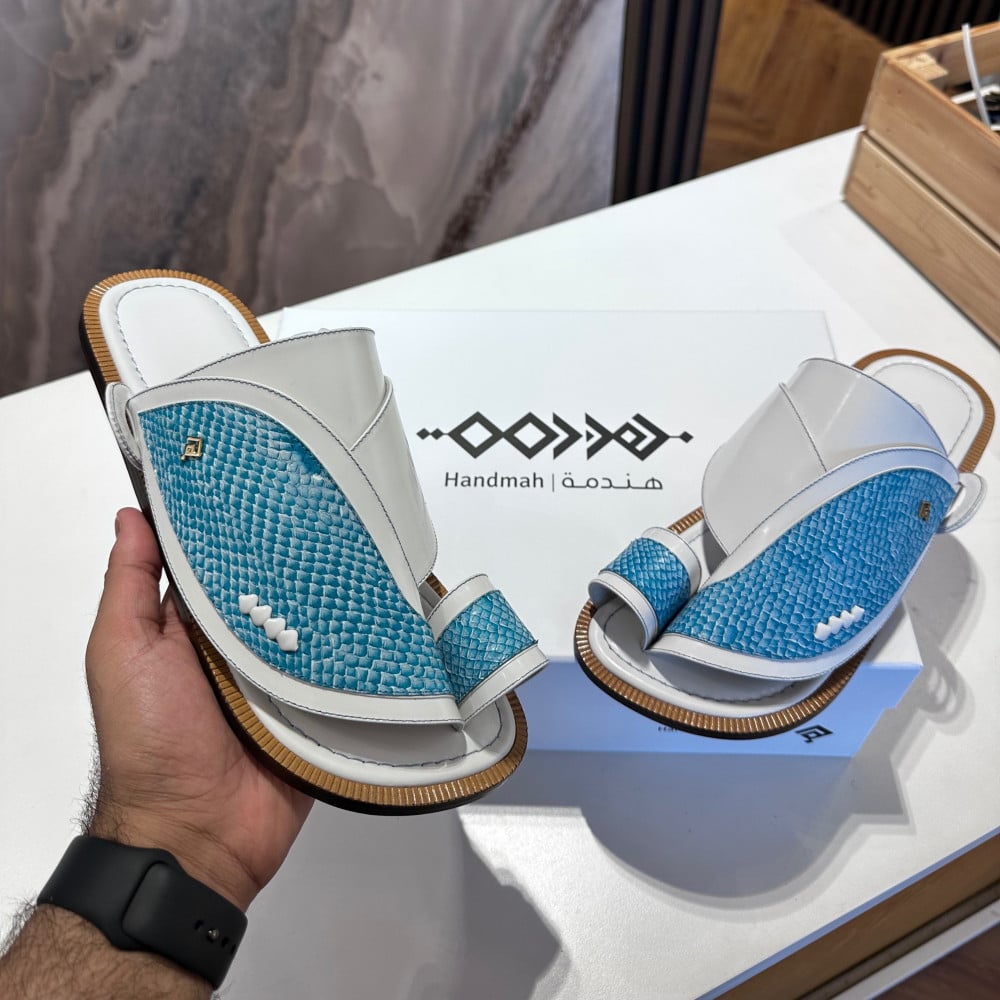 - يتميز نعال رجالي جلد سمك سماوي مموج ابيض بتصميم شرقي فريد وجميل، مما يضفي عليه لمسة فخامة وأناقة.