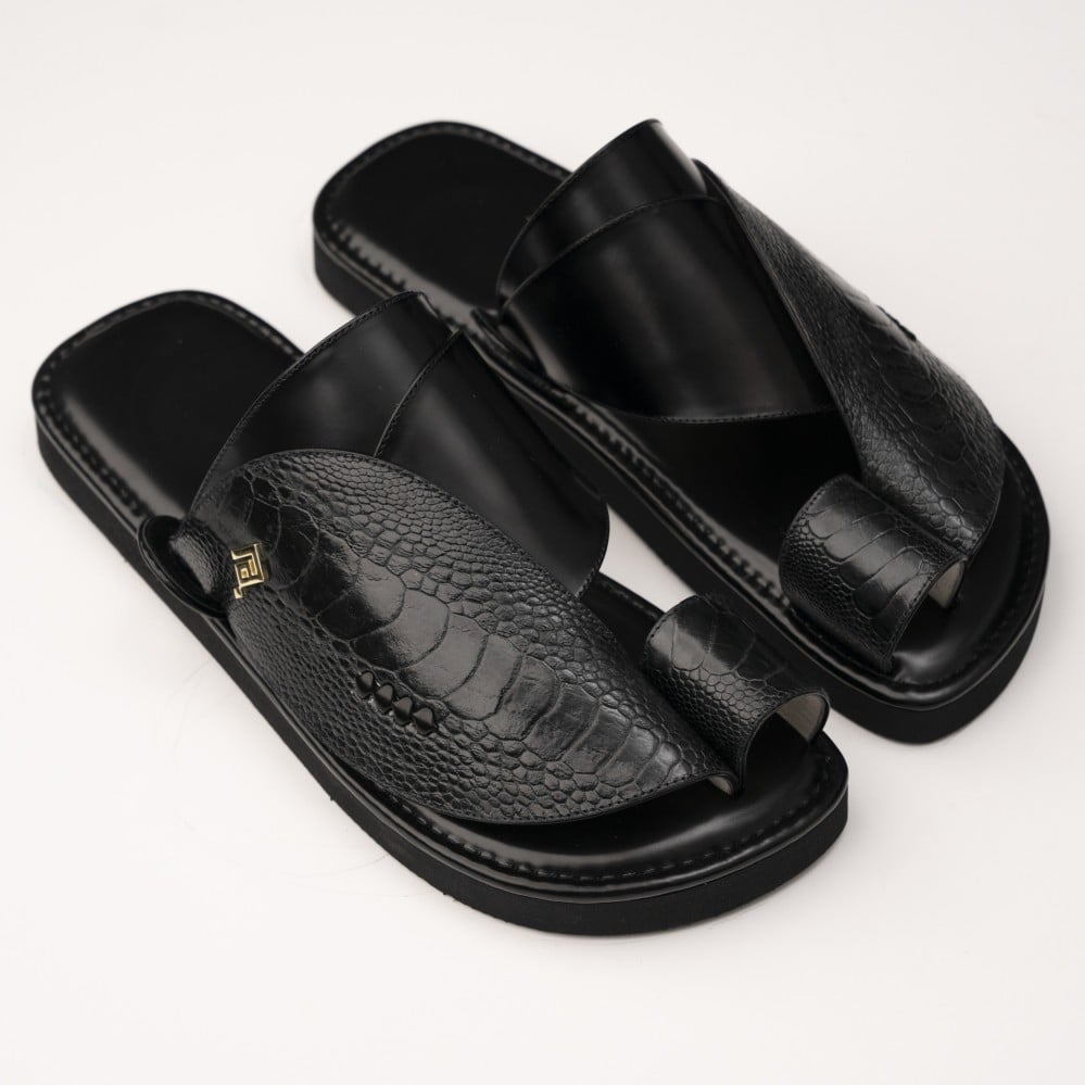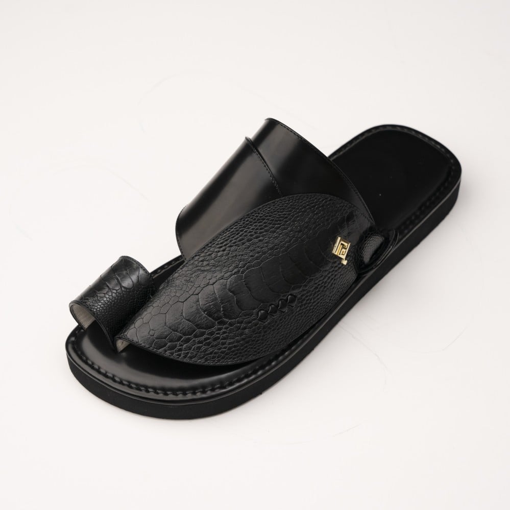 - يوفر شبشب جلد رجالي ساق نعام اسود تصميمًا فريدًا ومميزًا يبرز جمال الساق ويضفي لمسة من الأناقة على مظهرك العام.